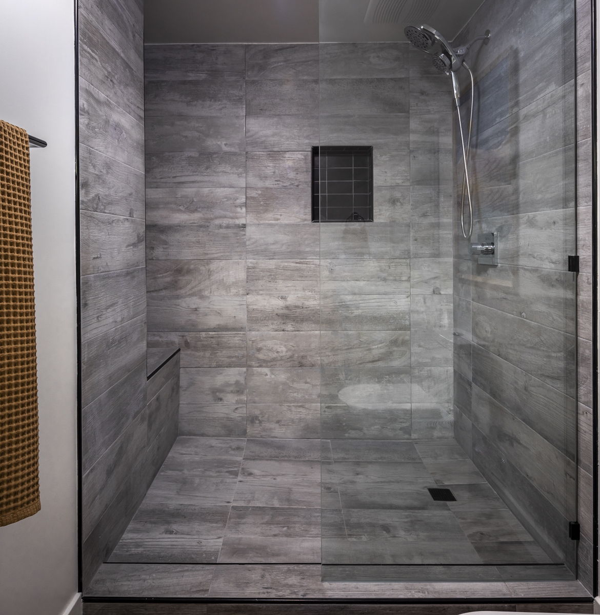 A soothing escape, this bathroom presents dual bowl vanity, tub, and gorgeous backsplash for a warmly-welcoming vibe.