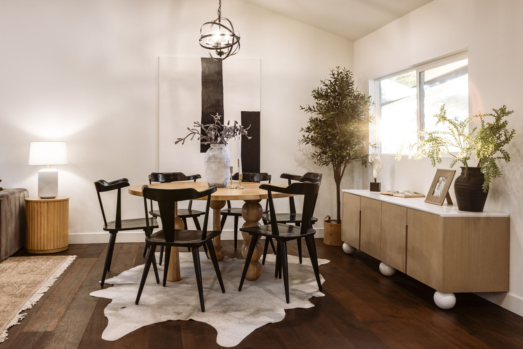 A chandelier that screams out for beautiful dining experiences, married with vaulted ceilings and oil finished wood floors.