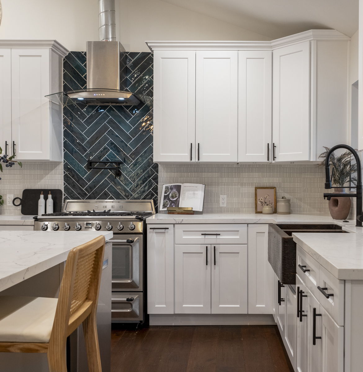 Culinary magic happens effortlessly in this kitchen, equipped with white cabinetry, hammered farmhouse sink, and Italian Smeg range.